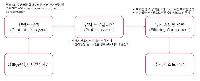 앞선 "추천시스템이란?" 포스팅에서 각 알고리즘에 간략하게 설명을 적어보았다. Contents-based Recommender System (컨텐츠 기반 추천 시스템) - 사용자가 과거에 좋아했던 아이템을 파악하고, 해당 아이템과 비슷한 아이템을 추천해준다. - 간단하게 예를 들어 사용자가 과거에 스파이더맨과 아이언맨을 즐겨보았다면 타이타닉보다는 캡틴 아메리카를 추천해 줄 것이다. 즉, 위와 같은 예시는 스파이더맨, 아이언맨이 타이타닉보다 캡틴 아메리카와 더 유사하다는 결론에서 나온 결과이며 아이템끼리의 유사도를 구하는 것이 컨텐츠 기반 추천시스템의 목적이라고 볼 수 있다. 이러한 컨텐츠기반 추천시스템의 목적을 다시 한번 상기시키고 좀 더 상세하게 알아보도록 하자. 컨텐츠기반 추천 시스템이란? 정보검색(..